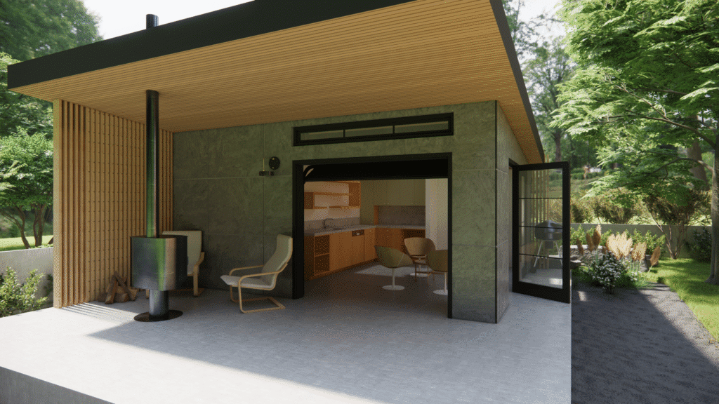 Next Image Silkaitis Close Up v2 – Overhead garage door along with bifold door openings allow for indoor outdoor connection